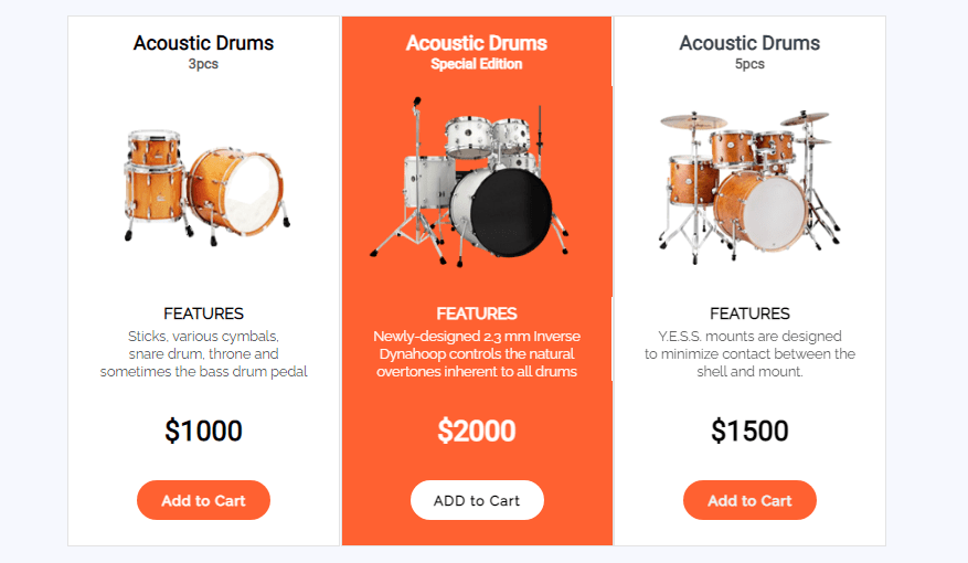 Let us see the example of acoustic drums that displays the three different pricing tables with the Add to Cart button option. This is pretty much useful if you have an eCommerce website where you need to show the comparison with the similar kind of products.